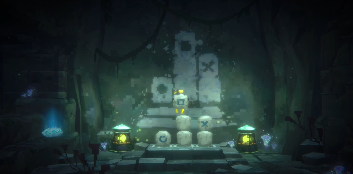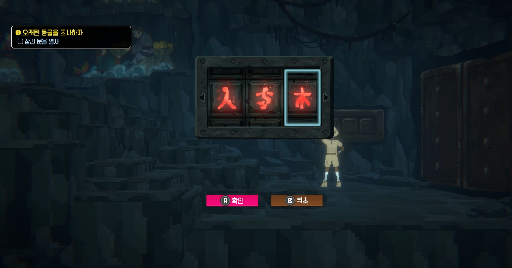 스시 가게를 운영하며 시간을 보내면, 밤에 닥터 베이컨의 시점으로 바뀌어 동굴을 탐험하게 됩니다. 동굴에는 어인족들의 역사 그림들이 기록되어 있고, 마지막엔 문자로 된 장치가 있습니다. 정답은 앞에 있는 그림들을 살펴보면 알 수 있습니다.