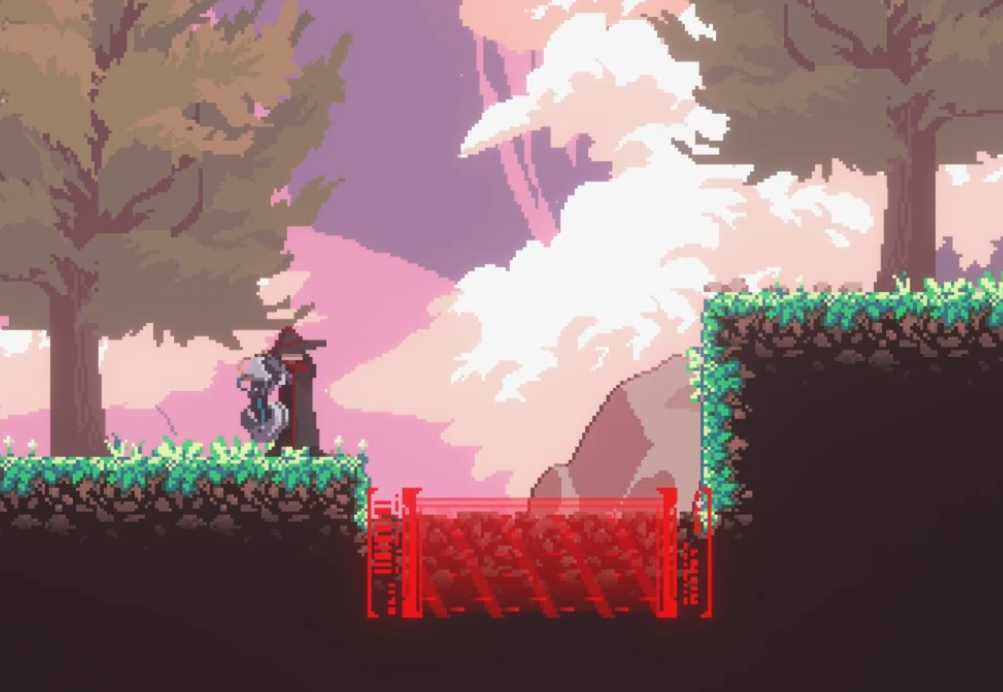 산나비의 주인공, 플레이어블 캐릭터는 벽을 탈 수 있고, 팔에 있는 사슬팔로 벽을 잡고 다닐 수 있습니다. 모든 벽을 잡을 순 없지만, 딱 구분이 되도록 맵 디자인이 되어 있습니다.