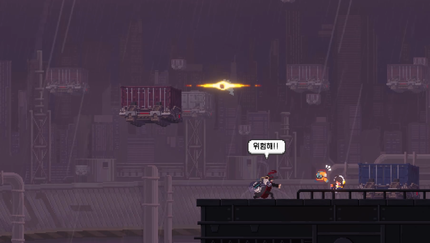 양쪽에 있는 컨테이너 위에서 공격을 피하면 됩니다.