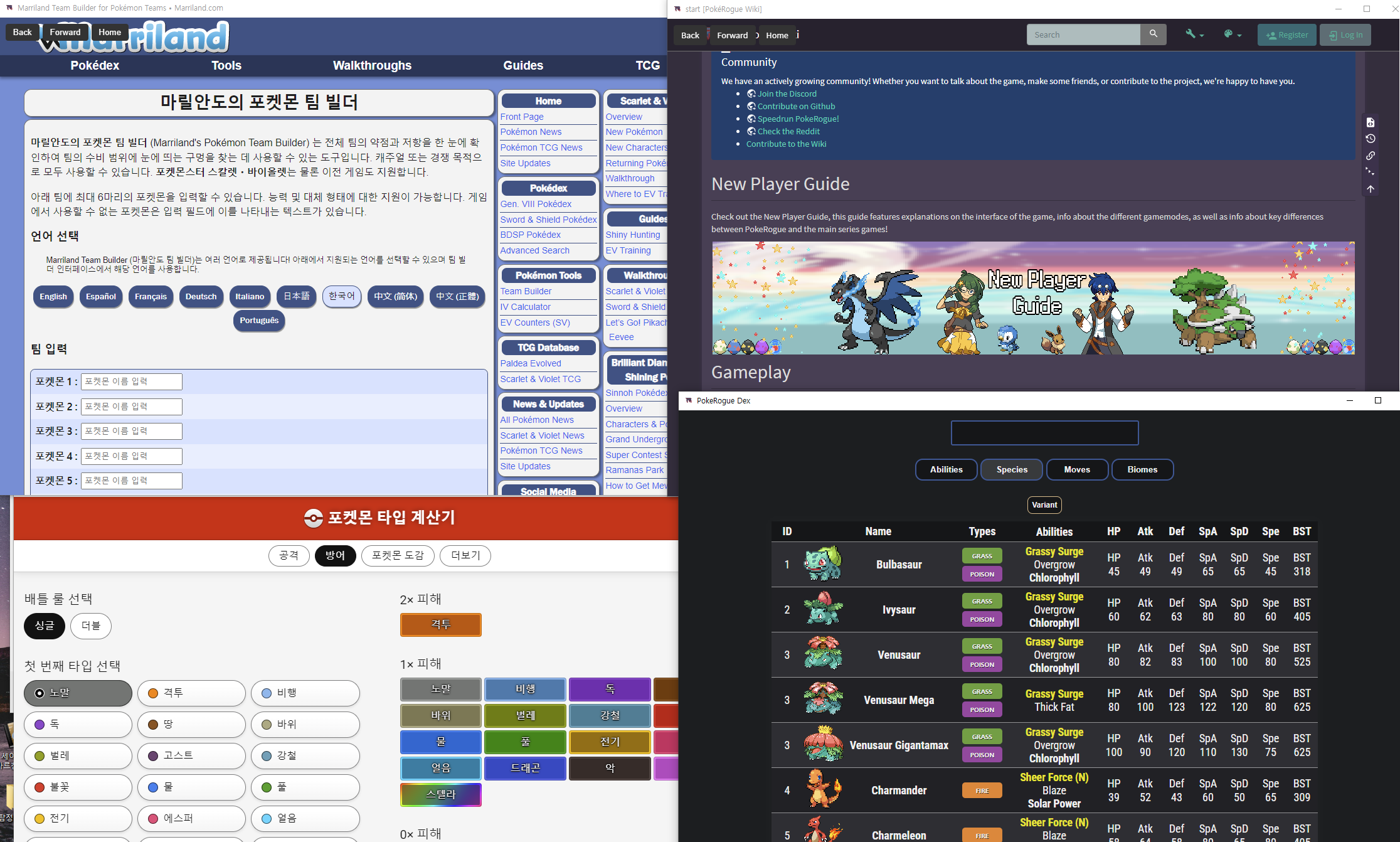 재미있는 것은 도움이 되는 여러가지 유틸리티를 지원한다는 점입니다. 포케로그 위키, 도감, 타입차트와 계산기, 팀빌더 등을 제공합니다.