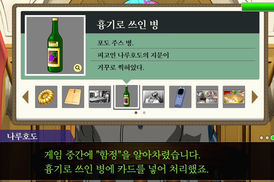 나루호도는 함정용 카드를 발견하고 병에 넣어 처리했다고 했는데, 그 병이 다른곳에서 등장했습니다. 이는 원래 있던 포도주스 병을 바꿔치기 했다는 증거입니다.