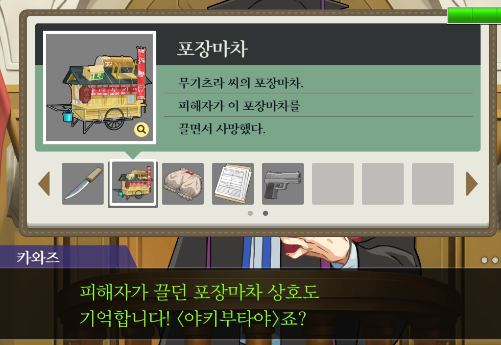 휴식 시간이 끝나고 다시 증언에 대한 신문이 시작됩니다. 전에는 잡아 내지 못한 이 부분에 [추궁하기] 를 합니다
