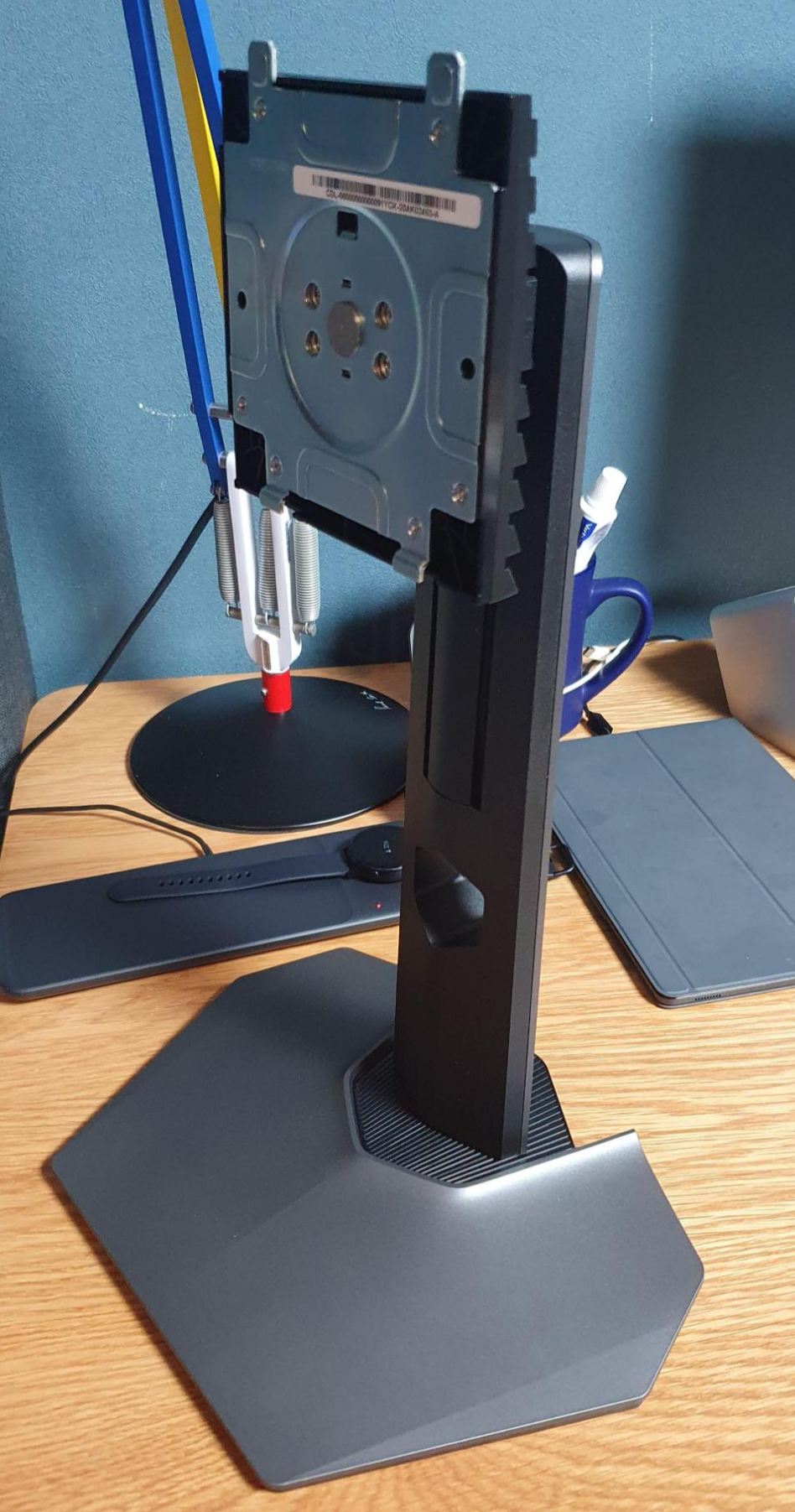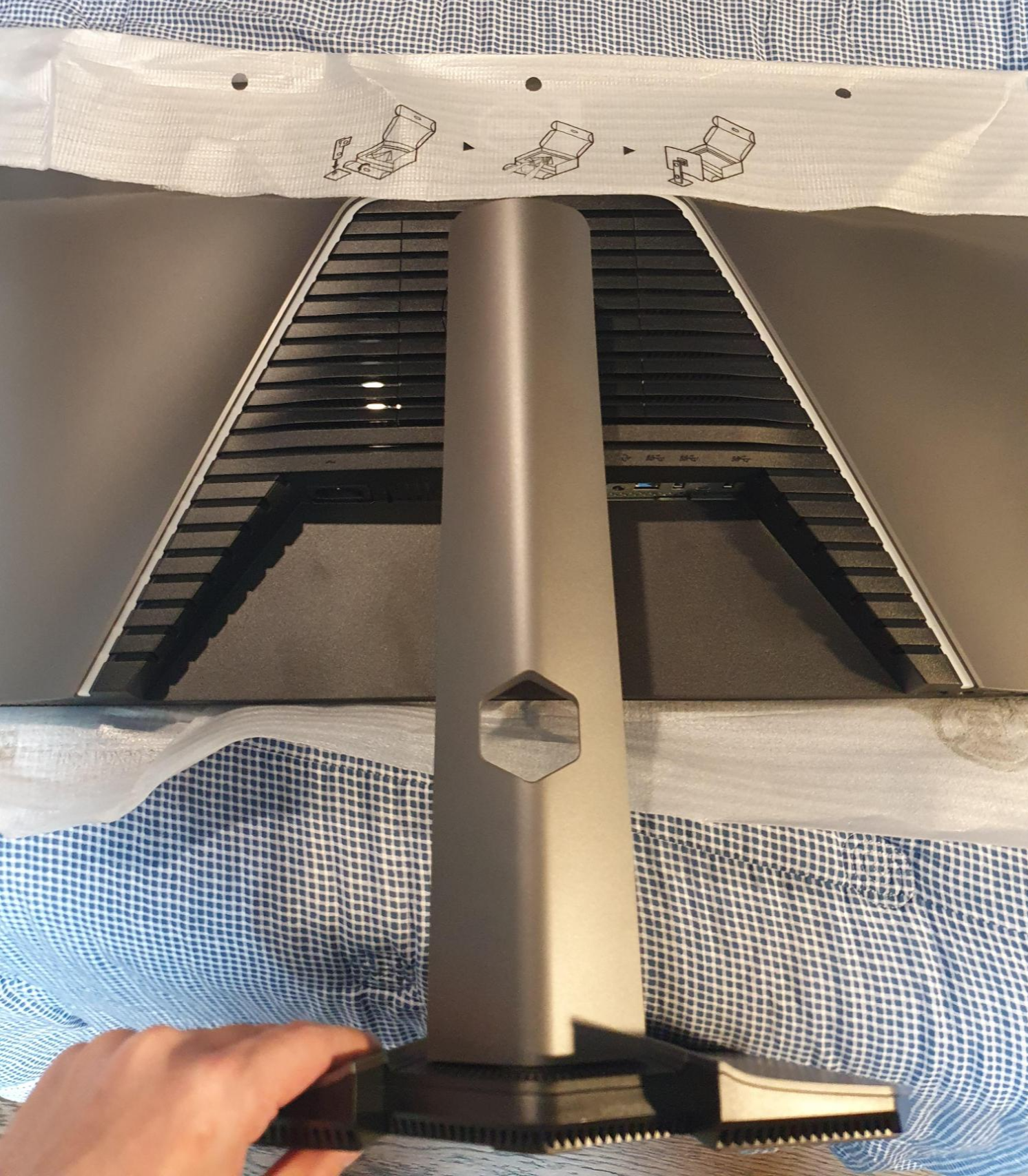 스탠드 하단부와 목부분(?)을 조립한 뒤에, 누워있는 모니터 본체 뒤에 꽂으면 됩니다. 모니터 비닐 커버에 이런식으로 하라고 가이드가 되어 있습니다.