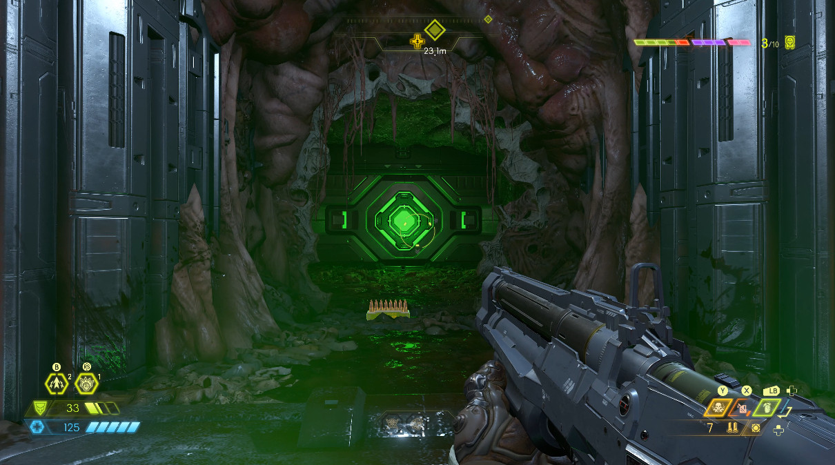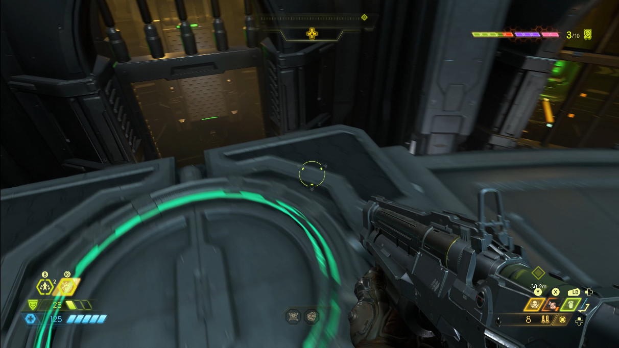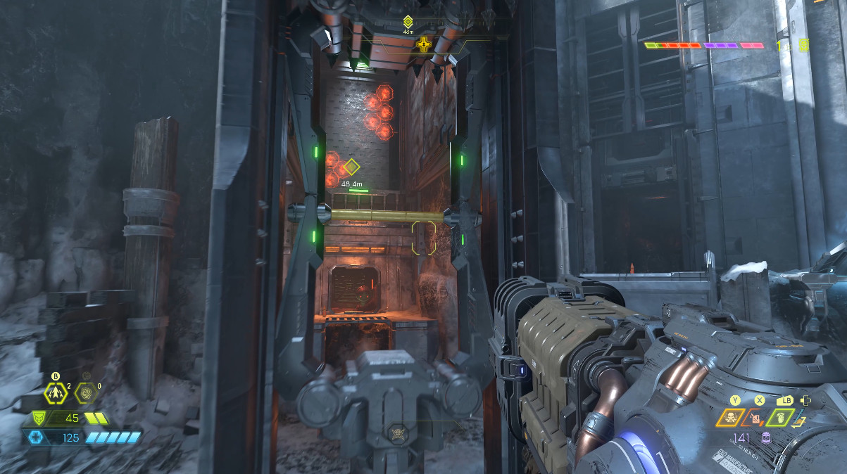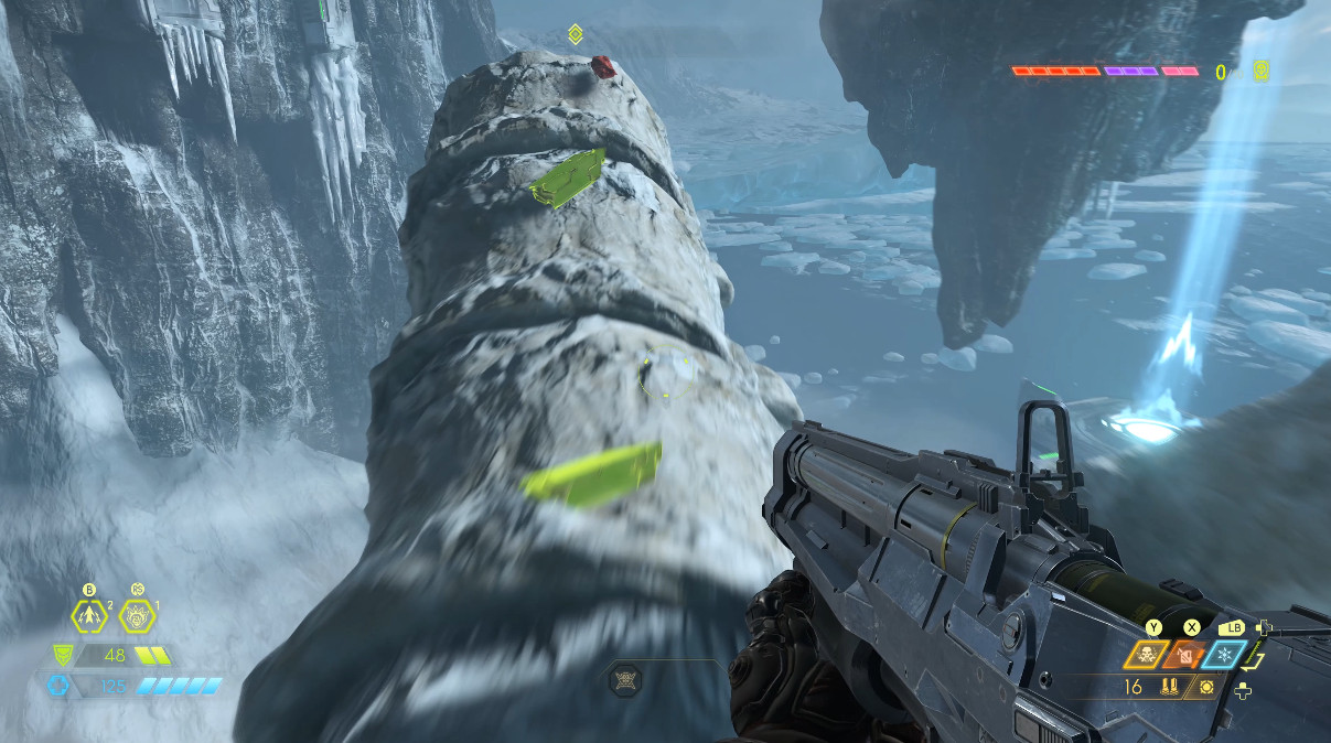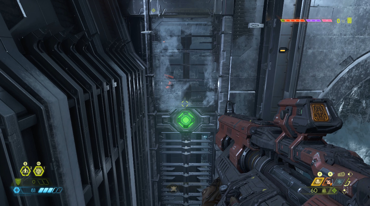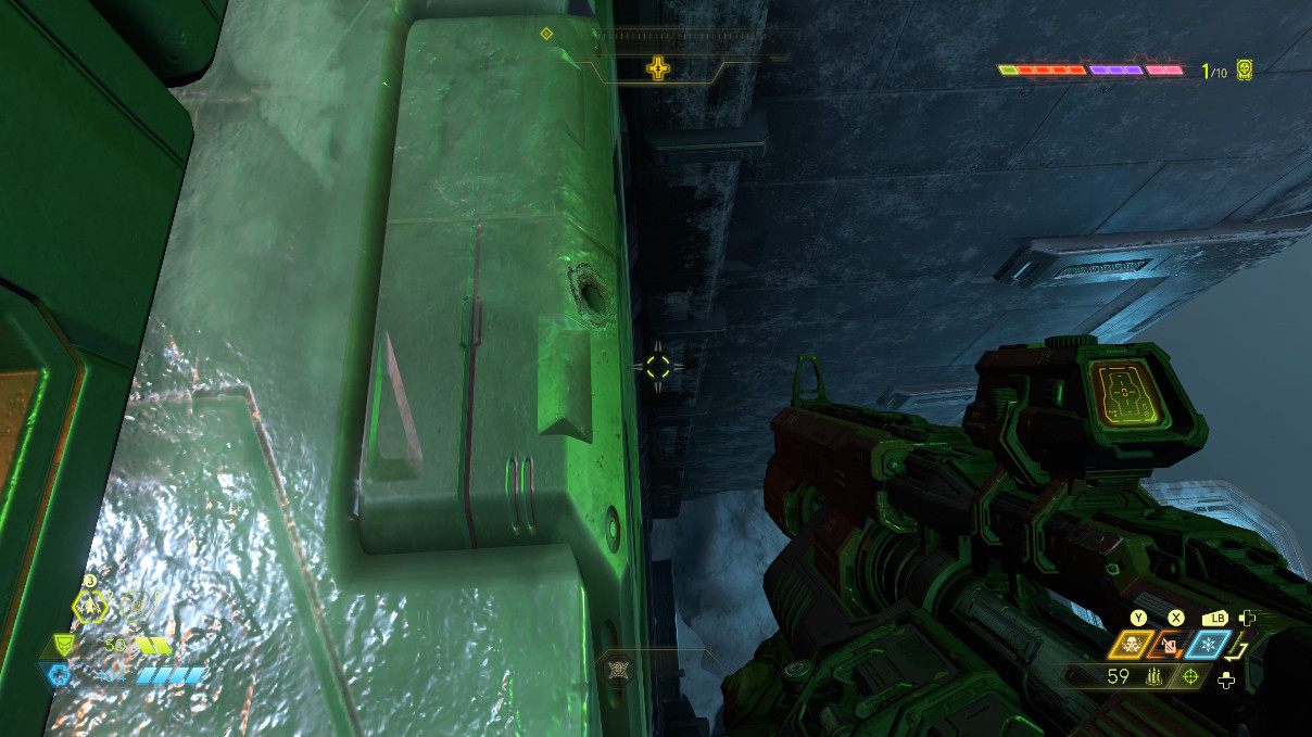 진행하다보면 아까와 비슷한 곳이 나옵니다. 여기서 팁은 굳이 공중에서 쏴서 열고 들어가지 않아도 된다는 점입니다. 문 앞에 공간이 있으니 그곳에 서서 초록색 근처 벽을 쏴도 문이 열립니다. 판정이 좋습니다.