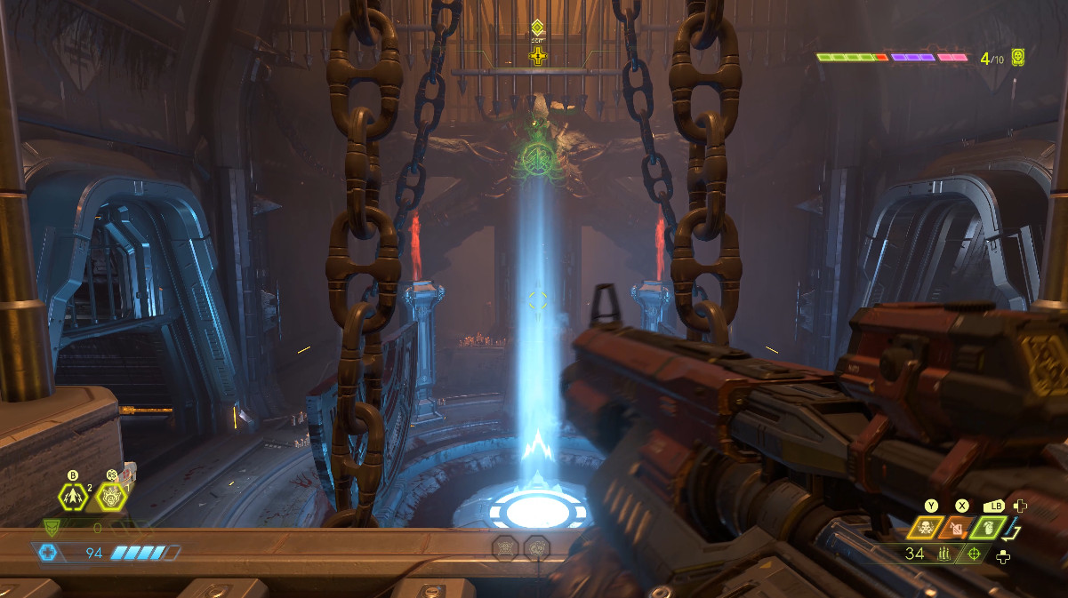 쭉 진행하다 보면, 왼쪽 사진과 같은 곳이 나오는데, 저 원형 패널(?) 위에 몇초간 서있으면 적이 등장합니다. 위에 사슬에 묶인 초록색 빛나는 물체를 쏘면 칼날이 나와서 적을 공격해줍니다. 이용해서 전투를 하면 훨씬 쉬워집니다.