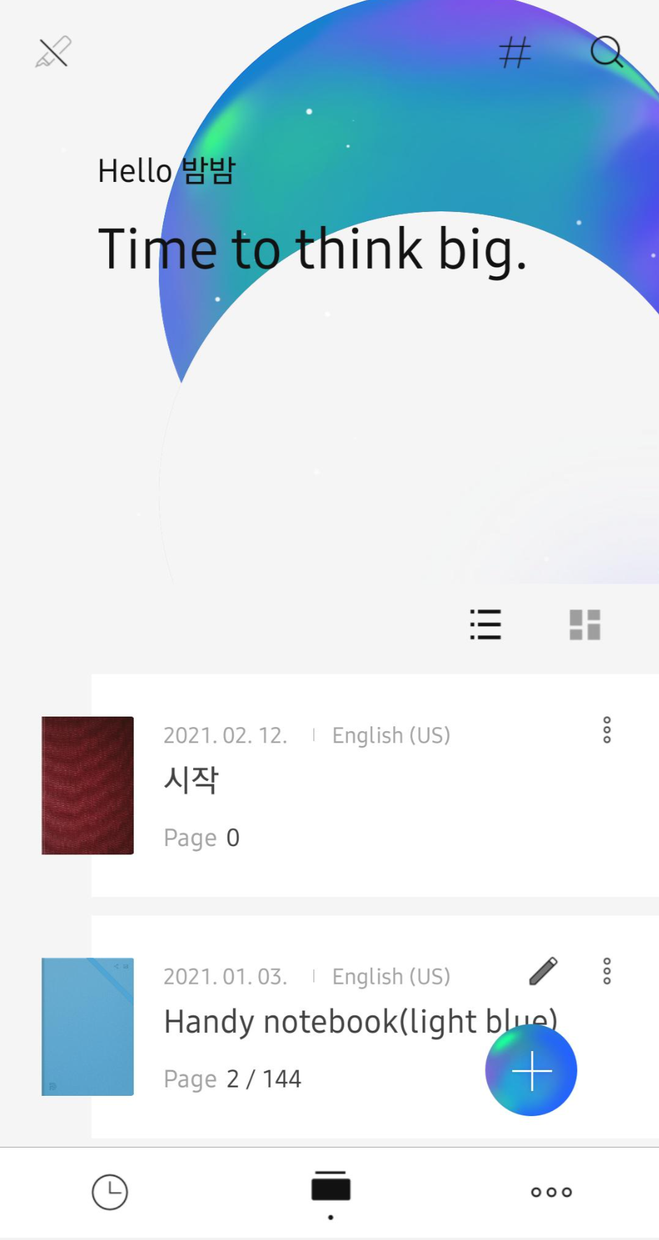 대충 이런 느낌입니다. 노트 리스트가 어플에 뜨고, 그 노트로 들어가 원하는 페이지를 누르면 열람이 가능합니다. 노트에 적는 것도 일반 펜과 똑같은 느낌입니다.